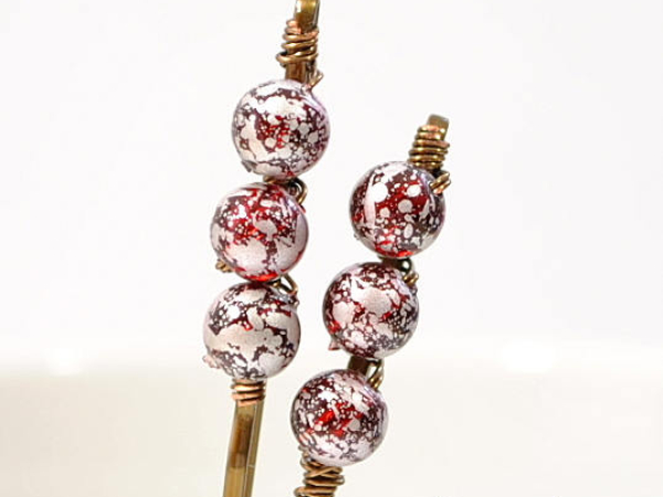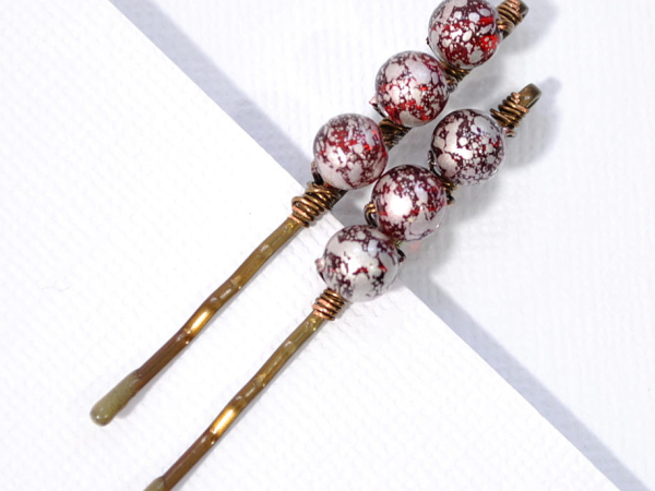 Smooth red beads with with a silver sponge finish are wire wrapped to bronze color bobby pins.