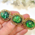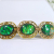 This stunning dragon's eye barrette is embellished with three domed cabochons of iridescent green and blue foil. Champagne color crystal rhinestones are set along the starburst frame. The metal embellishment is secured to a silver French barrette.