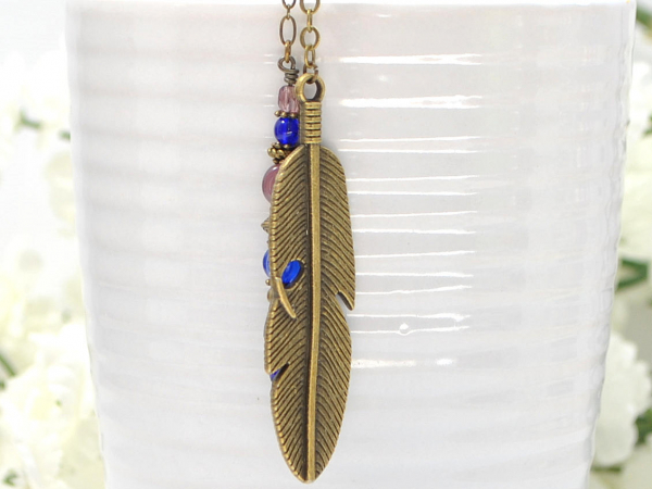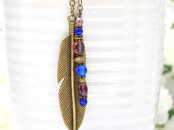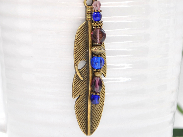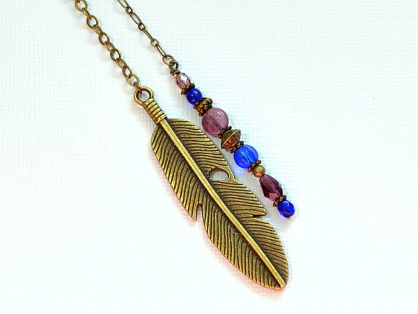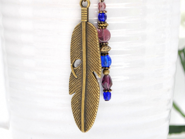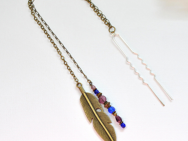 This hair charm is made with an aged bronze feather hanging from a bronze chain. A purple, blue, and bronze beaded charm hangs alongside on a second bronze chain.