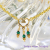 Emerald green Swarovski crystals dangle below an aged gold heart charm. The heart is set in the middle of a gold stainless steel chain that will not tarnish. It closes with a large lobster clasp and a jump ring.