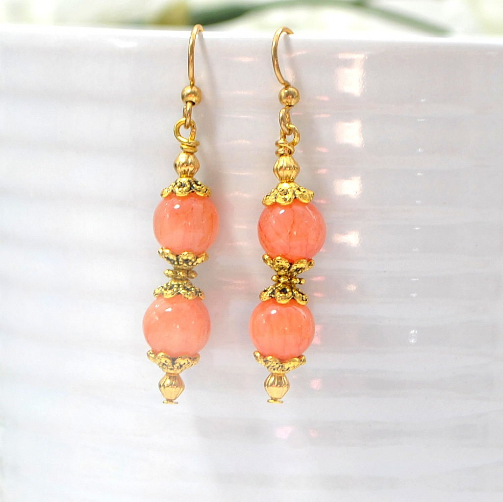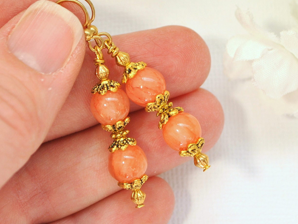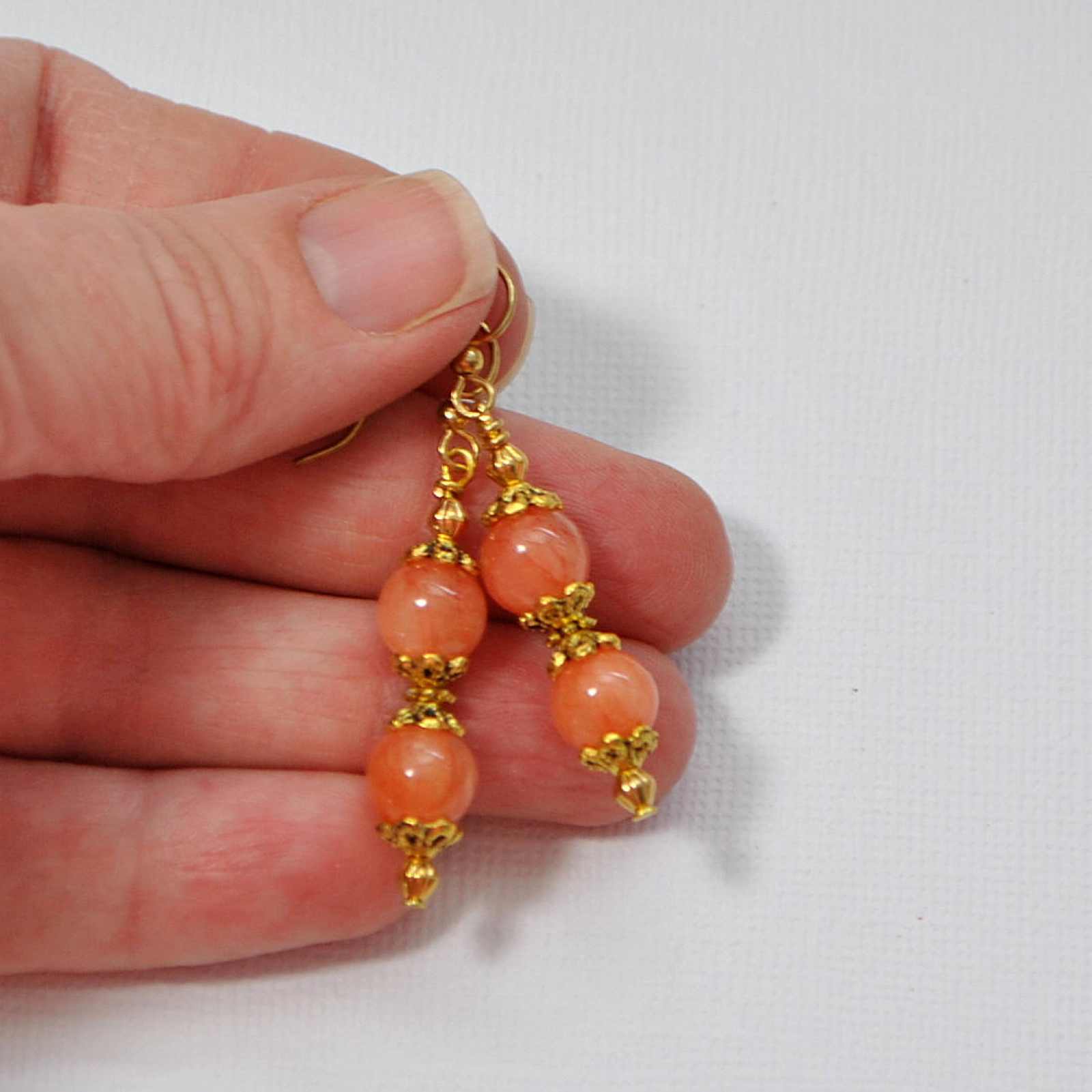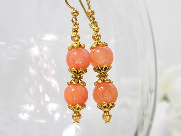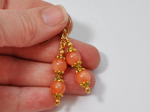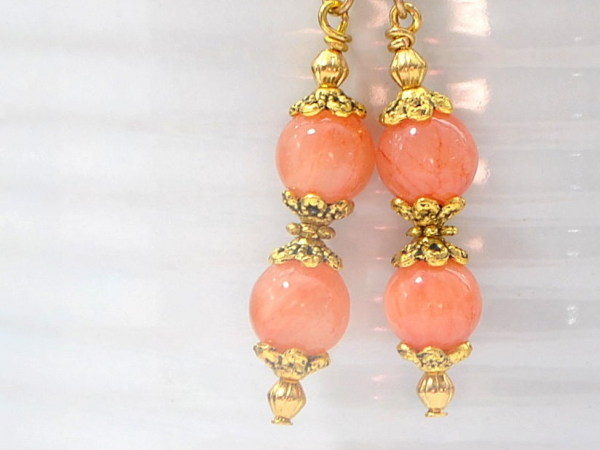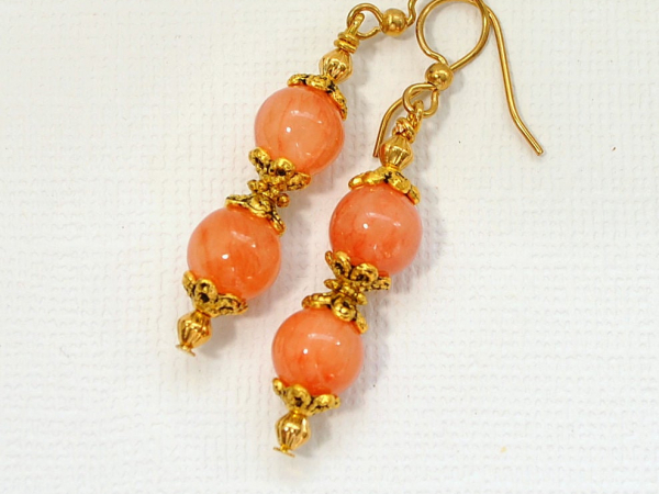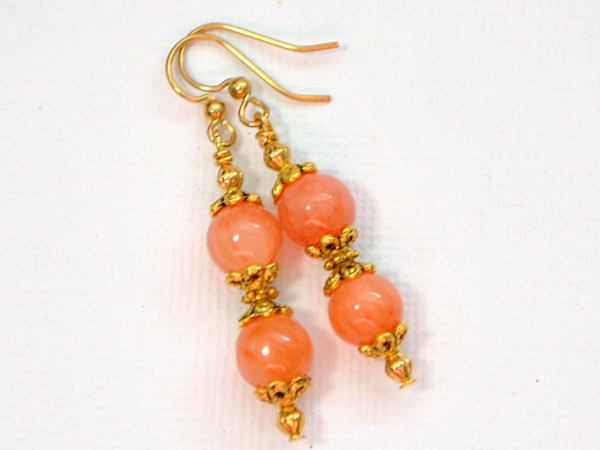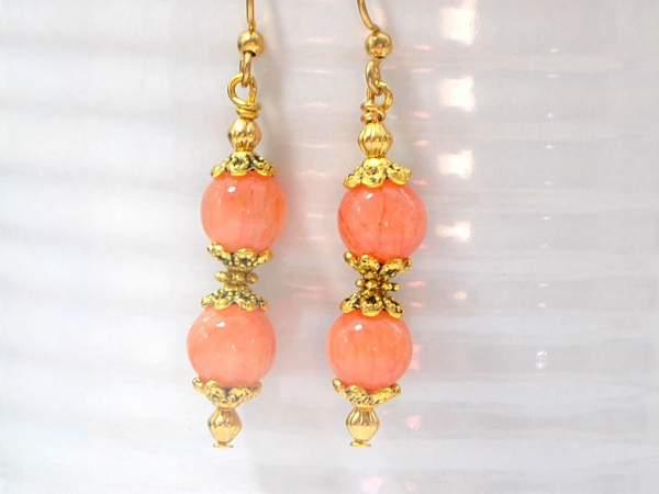 These pretty drop earrings are made with pink gemstone beads placed between aged gold bead caps. Small gold bicone beads complete the design.