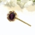 Small purple crystals are set in a floral frame that surrounds a large, oval crystal. The purple and gold embellishment is secured to a bronze bobby pin that will blend well with most hair colors.